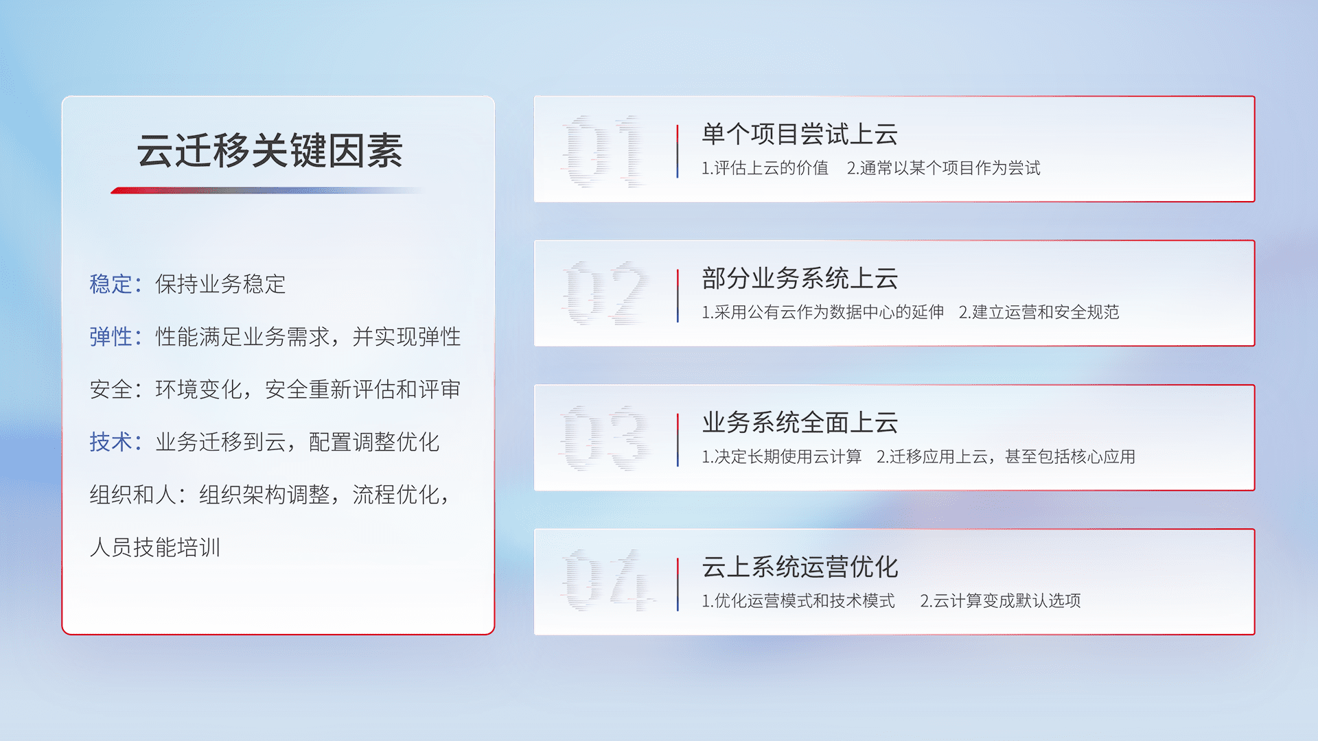 结合实际业务,,从规划设计、、、云平台选型、、、云原生改造、、数据迁移、、、集成交付,,,迁移全过程为客户识别最佳上云路径,,做好风险识别管理,,,,设计网络架构、、、、身份权限、、安全审计合规、、操作审计、、、、日志审计、、监控告警策略、、、多站点容灾设计等,,,对云上基础设施进行整体规划,,,,提升IT治理水平,,,以满足弹性、、、高可用、、高性能的需求。。