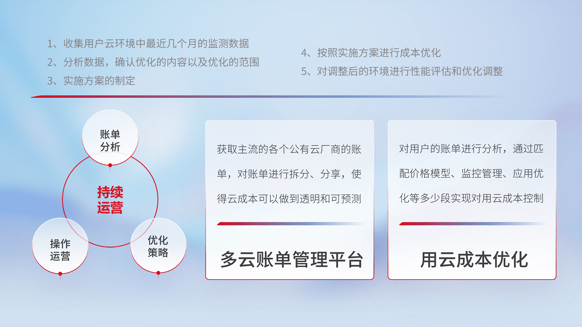通过多云纳管,,,以统一的资源数据模型把客户的云资源进行抽象和封装,,,进而实现对多云资源的统一操作,,保障云资源管理的可靠性、、、、稳定性与可用性。。。量身定制化运维内容,,,,配置、、、、开发运维、、补丁管理、、、备份、、、、监控、、认证和访问管理、、、审计和日常巡检等,,保障在用云过程中的可靠度,,稳定度以及高可用率。。。